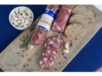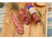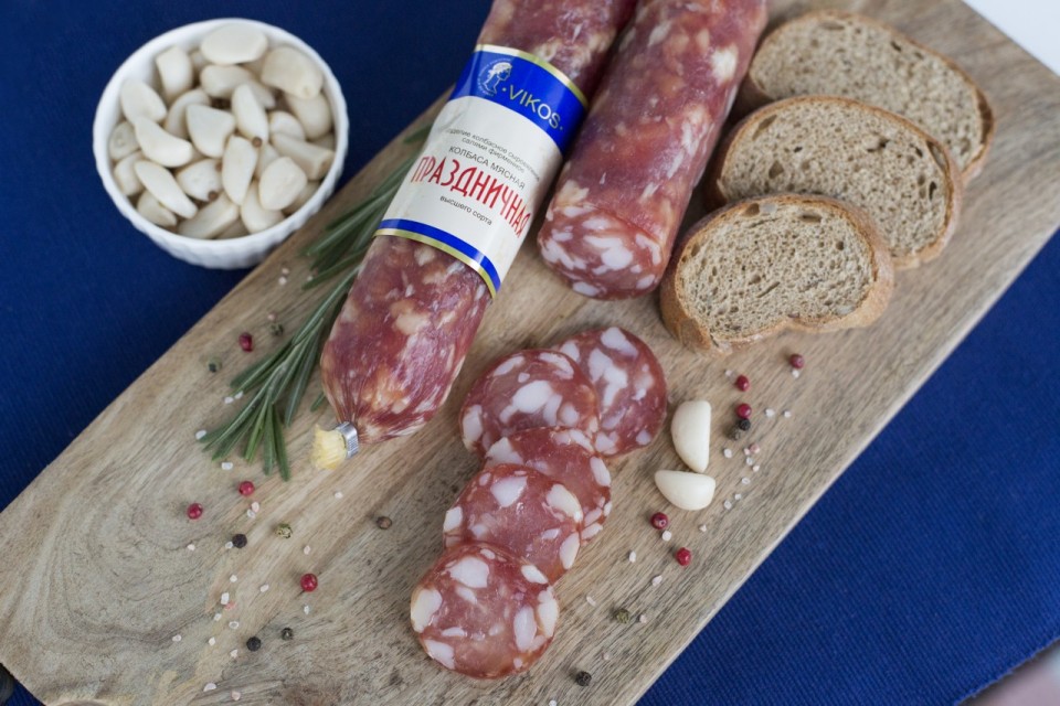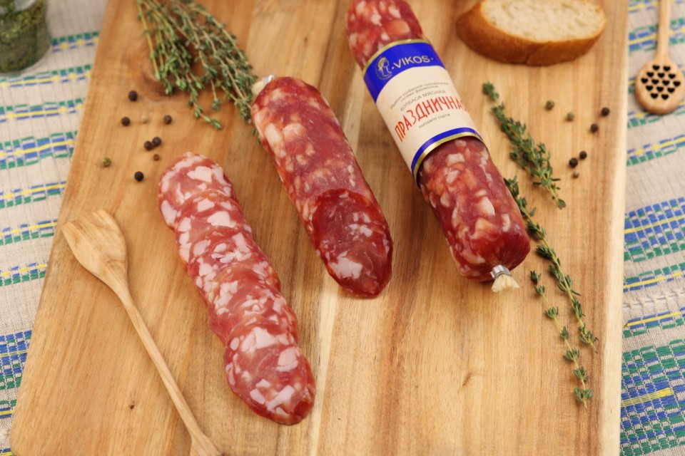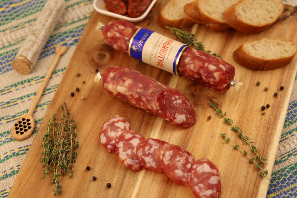Сыровяленая колбаса праздничная - это высококачественный деликатес с утонченным вкусом и ароматом. Изготавливается из натурального свежего мяса с использованием тщательно подобранных специй и пряностей. Этот изысканный продукт обладает плотной, немного суховатой консистенцией, которая делает его прекрасным дополнением к различным блюдам или закуской.